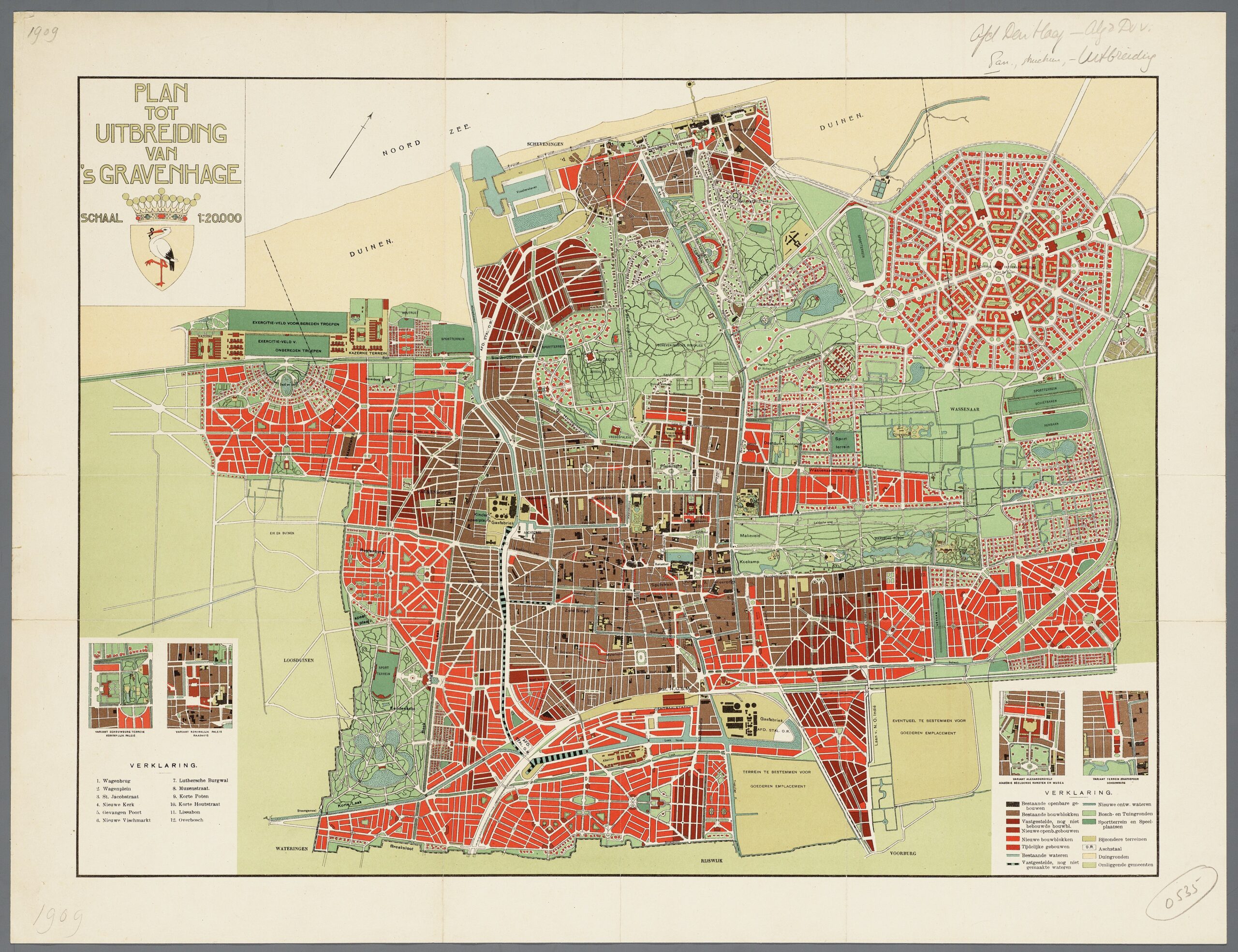 In August 1931, the municipality of The Hague established the Commission for the Development and Construction of The Hague, (Commissie inzake de Ontwikkeling en den Opbouw van ’s Gravenhage) which some called the Berlage Committee. This committee had the task of informing the municipal executive as thoroughly as possible, and a report was produced on The Development and Construction of The Hague (De Ontwikkeling en De Opbouw van ’s-Gravenhage). The report was prompted by the changing social circumstances and the crisis in which the country found itself. The committee was composed of Vrijenhoek (chairman), Bakker Schut, and seven experts. Representatives from the Association of Dutch Architects B.N.A., the Dutch Institute of Architects N.I.V.A., the department of Roman Catholic artists’ Enterprise and Freedom, and the Association of House and Land Owners Het Bezit were also involved. During council meetings on June 26 and July 10, 1933, contradictions arose regarding the development and construction of The Hague.
