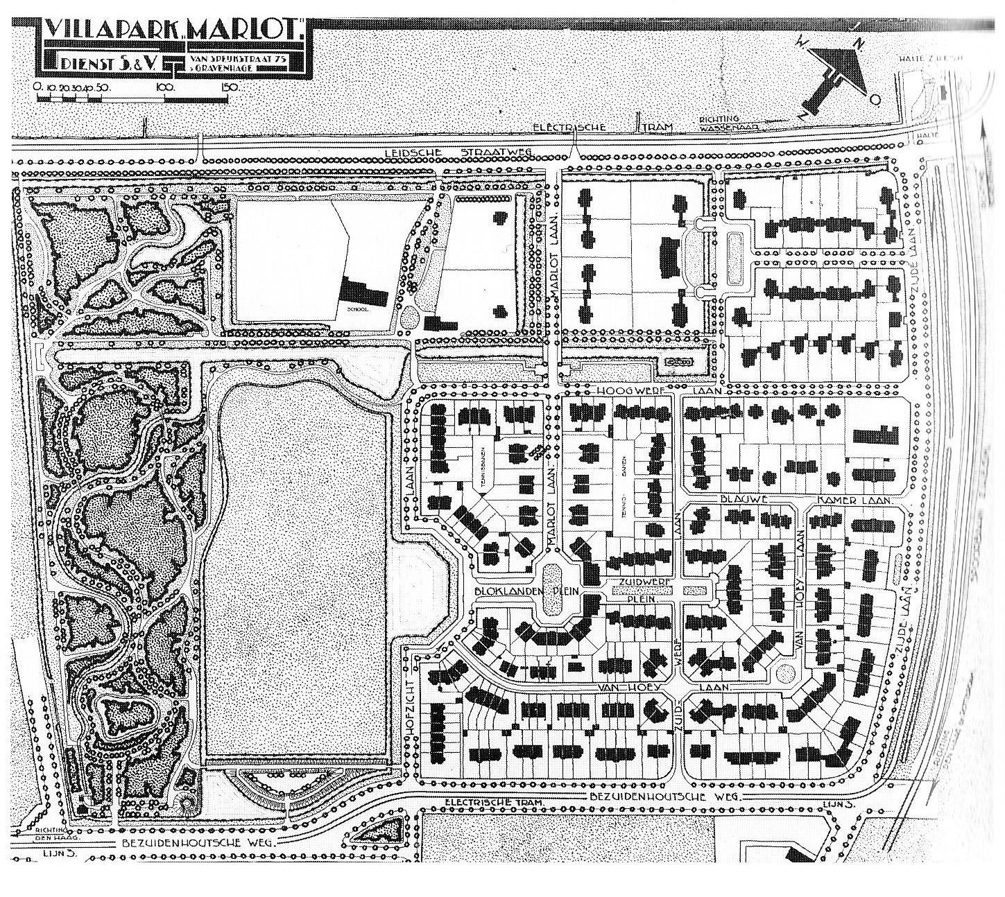 In 1920, urban planners Ir. H.E. Suyver and W. Schürmann from the Department of Urban Development and Housing (Dienst der Stadsontwikkeling en Volkshuisvesting) designed an urban plan that involved separating the park and the manor house of the Marlot estate from the newly developed residential park with villas. This separation was achieved by a spacious meadow and a large pond. Two squares were created perpendicular to this pond, forming the heart of the district: Bloklandplein, featuring a Roman Catholic church, and Zuidwerfplein. The alignment of these squares created a grand entrance to the garden neighborhood. In the center of the squares, there was a lawn with trees.