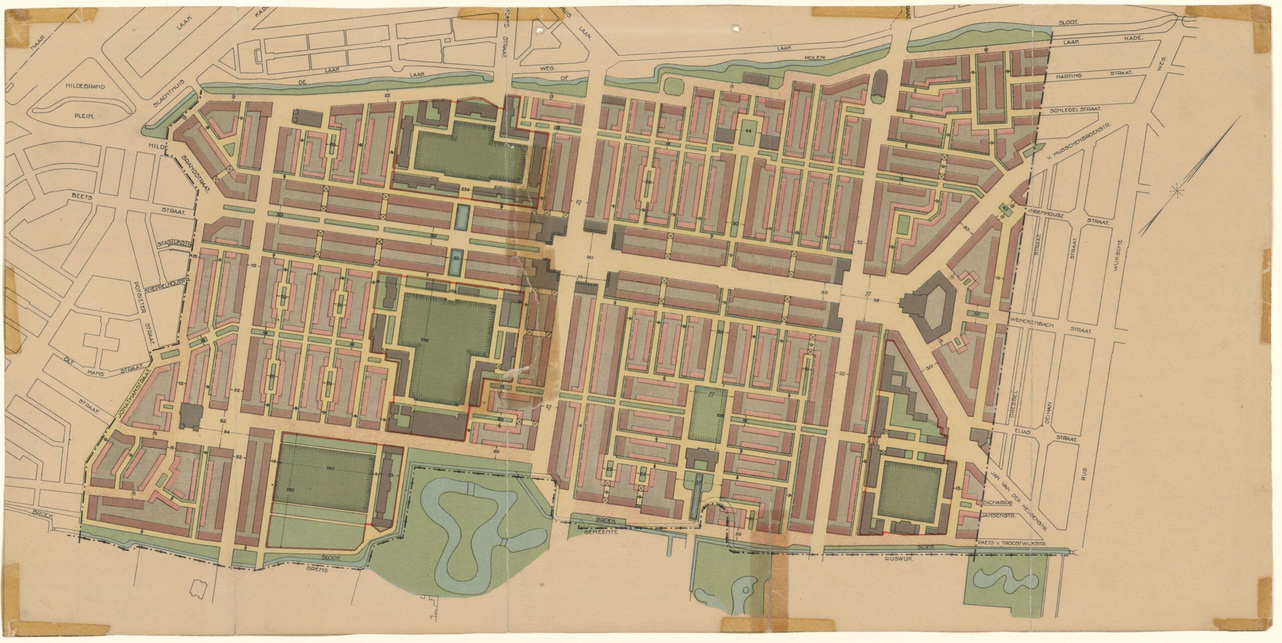 In the first phase, the buildings and urban spaces in The Hague were closely connected and formed cohesive urban ensembles. Some of these ensembles, such as Papaverhof and Marlot, are still considered iconic from the interwar period. Interestingly, the only part of Berlage’s expansion plan that was fully implemented was the Bomenbuurt, which was developed by the building-land-company Duinrust of Goekoop. A map from 1915, which includes the building plans, illustrates the relationship between the buildings and urban spaces (HGA z.gr.1324).