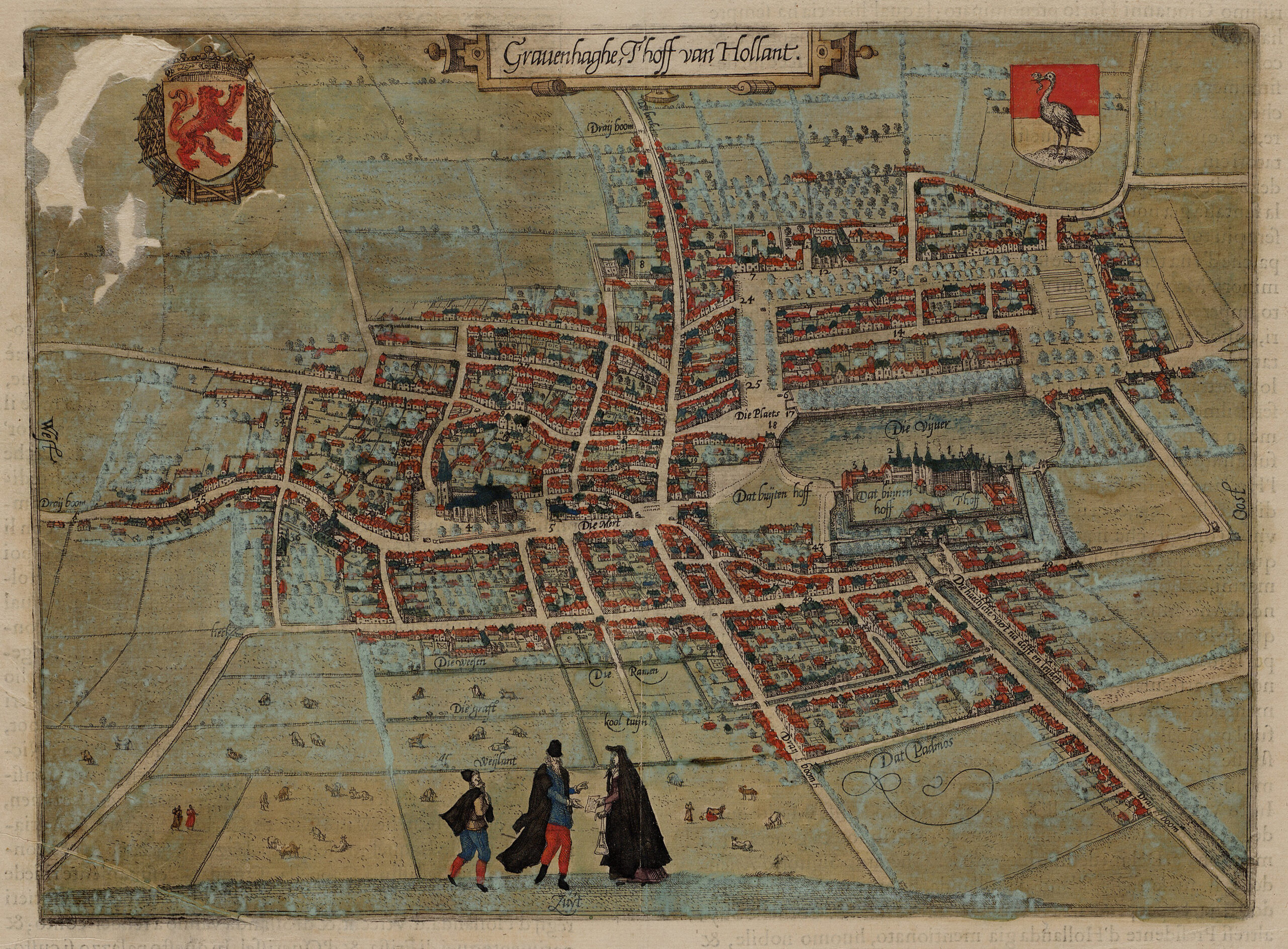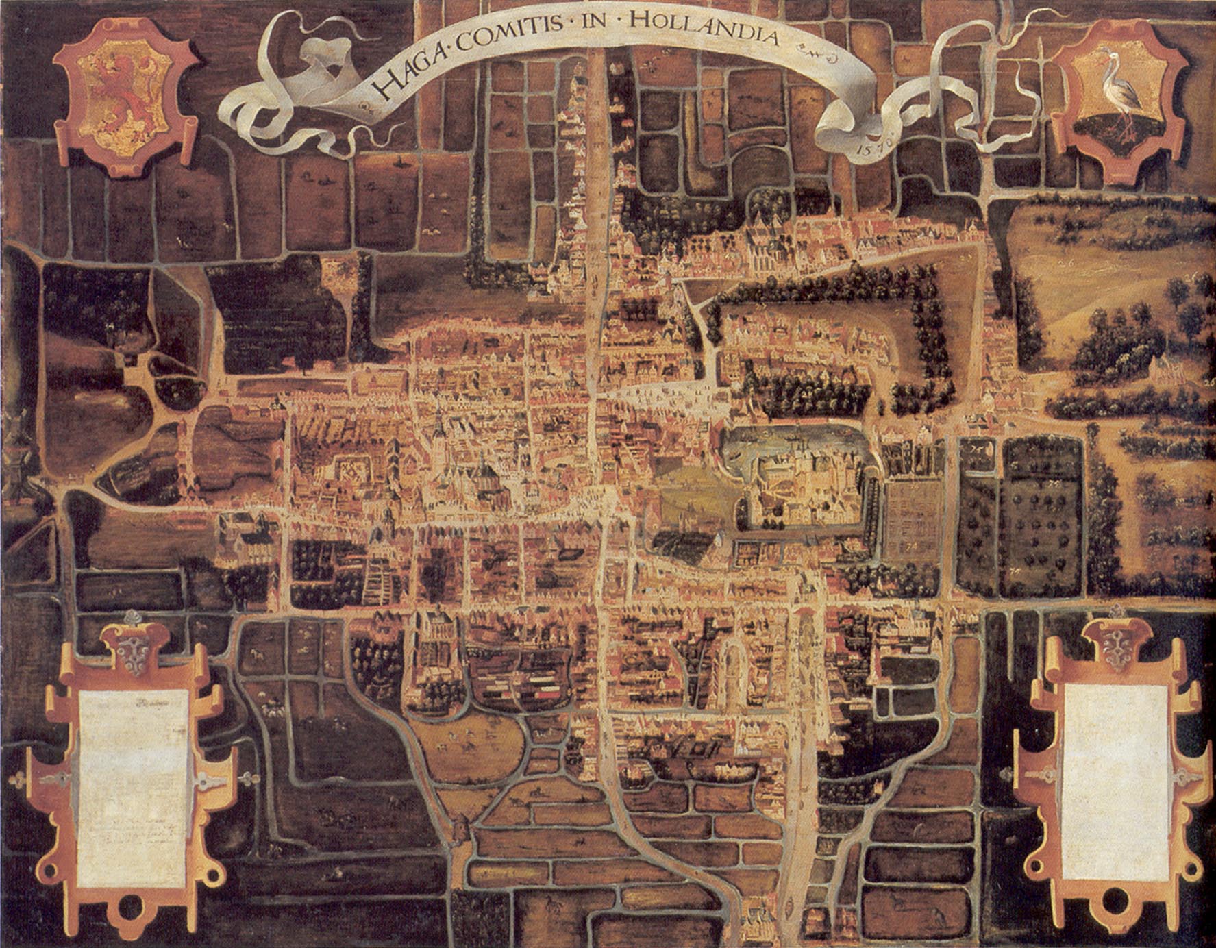 Other paintings from this period also confirm Guicciardini’s words and show a spacious and open village that was richly endowed withgardens and orchards and that connected to the Haagse Bos, for example the map of Jacob van Deventer from 1560 (HGA gr.0236) and the map of G. van Giesen from 1730 (HGA gr.0239) where the situation in 1570 is depicted.