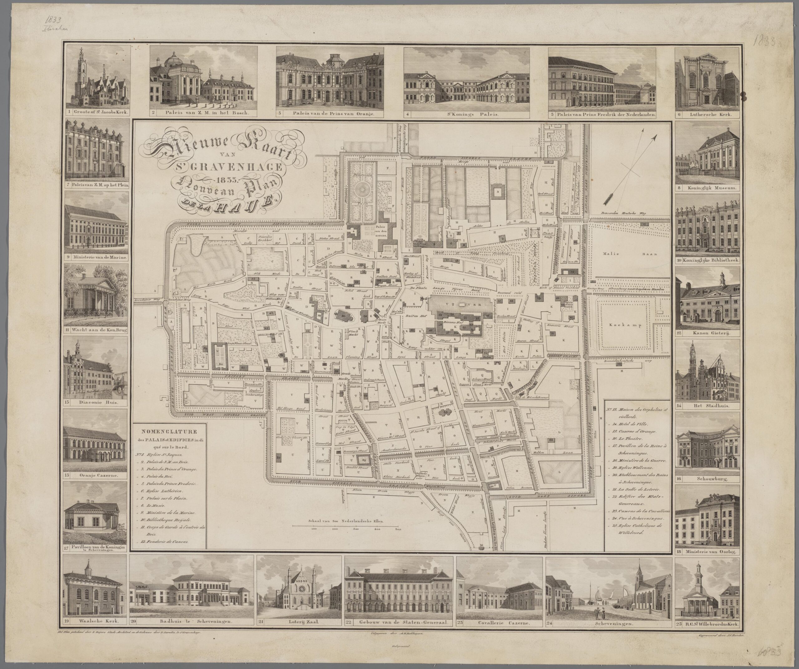 In the meantime, The Hague was gradually renovated as a residence and a representative city with monumental buildings. The Nieuwe Kaart van s’ Gravenhage 1833 Nouveau Plan De La Haije (HGA gr.0311) by city architect Zeger Reijers from 1833 and 1835 testifies to this. In the edge of a version from 1835, all monuments of the city are highlighted. The courtyards are not drawn, only the streets and squares with the monuments. All trees on the Voorhout, around the Vijverberg and along canals are individually indicatedper tree.